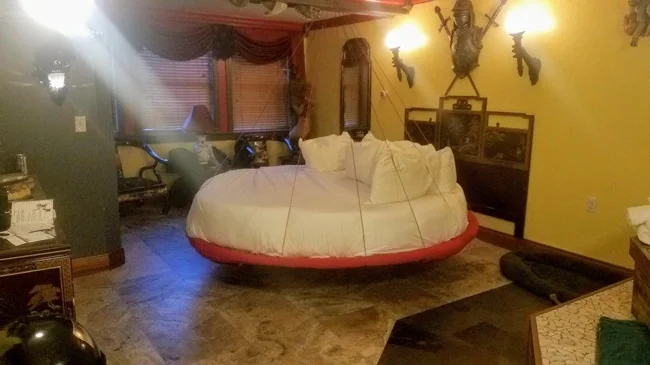 Номер в гостинице с подвесной кроватью, которая крепится к балке на полотке
