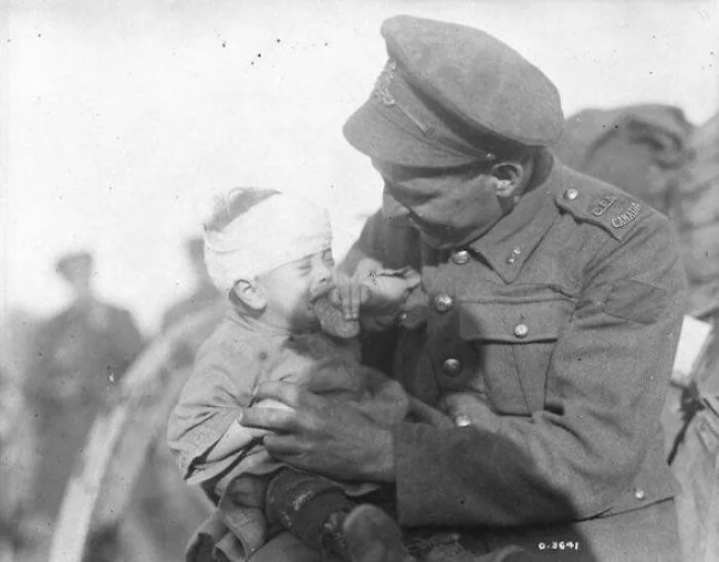 29. Первая мировая война. Канадский солдат утешает раненого бельгийского младенца, мать которого погибла от артиллерийского снаряда. Ноябрь 1918 года.