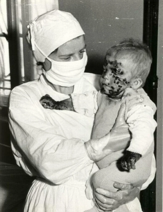 37. Медсестра с больным ребенком во время эпидемии оспы. Вроцлав, Польша, 1963 год