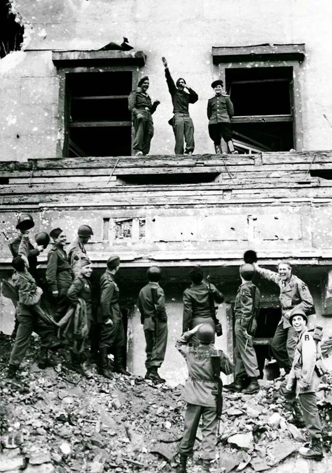 44. Солдаты союзных войск пародируют Гитлера на его балконе в рейхсканцелярии, 1945 год