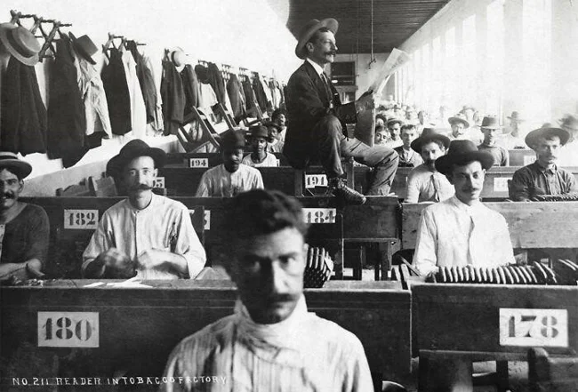 26. Наемный чтец усердно читает вслух рабочим на кубинской сигарной фабрике (примерно 1900-1910 года). Большинство рабочих были неграмотными, поэтому фабрики нанимали людей, которые зачитывали вслух романы, стихи, научно-популярную литературу и газет