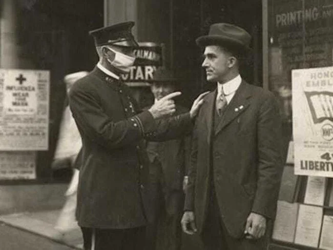 2. Полицейский в Сан-Франциско отчитывает мужчину за отсутствие маски во время пандемии гриппа 1918 года
