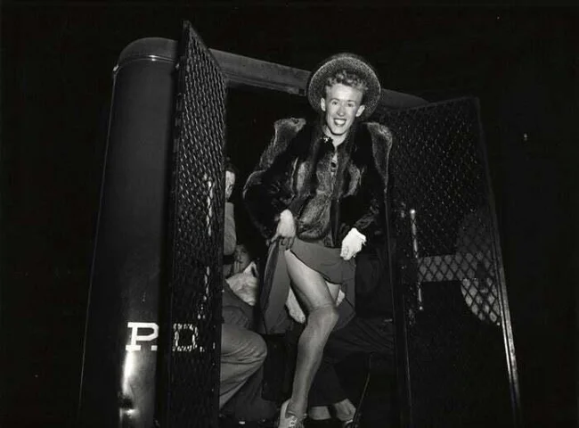 12. Арестованный за кросс-дрессинг мужчина выходит из полицейского фургона. Нью-Йорк, 1939 год