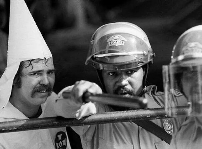 50. Член Ку-клукс-клана укрывается за чернокожим полицейским, после того, как толпа протестующих окружила собрание клана в Остине, Техасе. 1983 год ![]()