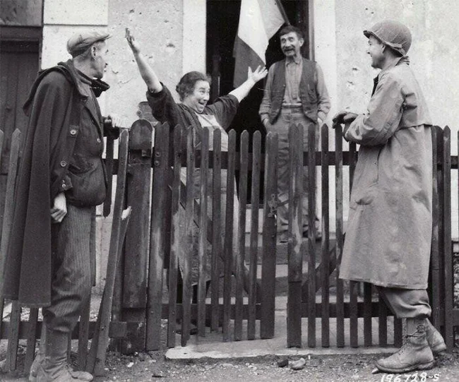 31. Француженка приветствует американского солдата через два дня после освобождения. Страсбург, Франция, 22 ноября 1944 года