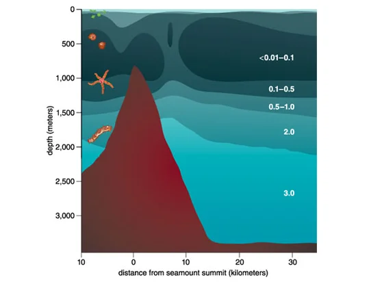Но на дно опускается не только кислород. Под силой гравитации в ЗКМ опускаются сотни тонн органики из верхних слоёв океана. Гнилостные бактерии, застоявшиеся на уровне 500-1000 метров, жадно высасывают из воды практически весь кислород. Так формируется слой воды, в котором содержание кислорода ниже, чем где бы то ни было ещё.