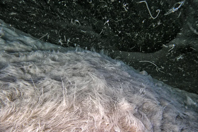 Длинноногих и жутких морских пауков сменяют юркие креветки, тут и там расцветают морские кораллы, между ними ютятся колонии моллюсков и многощетинковых червей. А потом всё это разнообразие в одно мгновение сменяется мёртвыми, покрытыми невыразительным серым ворсом, скалами. Добро пожаловать в зону кислородного минимума.