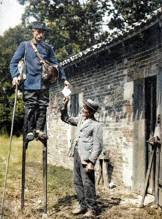 Доставка почты на ходулях в сельской местности; гасконский край Пеи-де-Бюш, Франция, начало XX века.