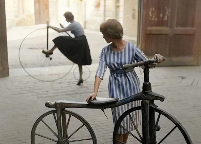 Уже были нормальные велосипеды в эти года, так что сударыни просто шутейничают.