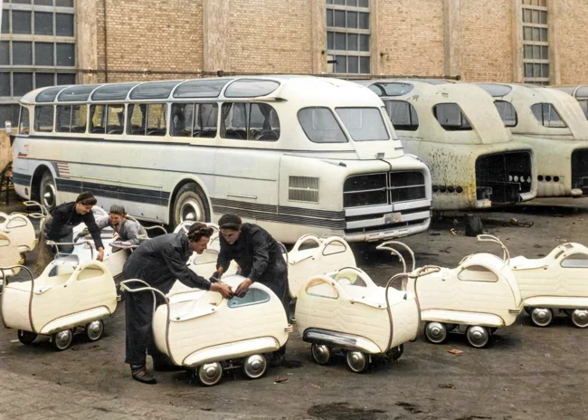 Производство детских колясок на заводе Икарус в Венгрии, 1954 год.