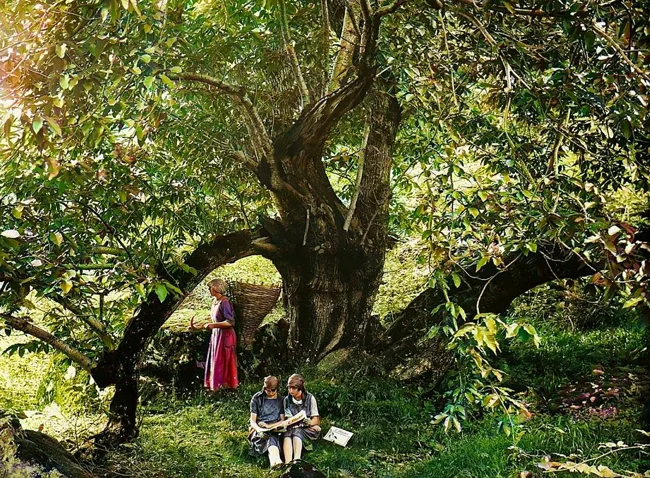 Три девушки в перерыве от работы в поле под деревом. Швейцария, 1900-1932 год.