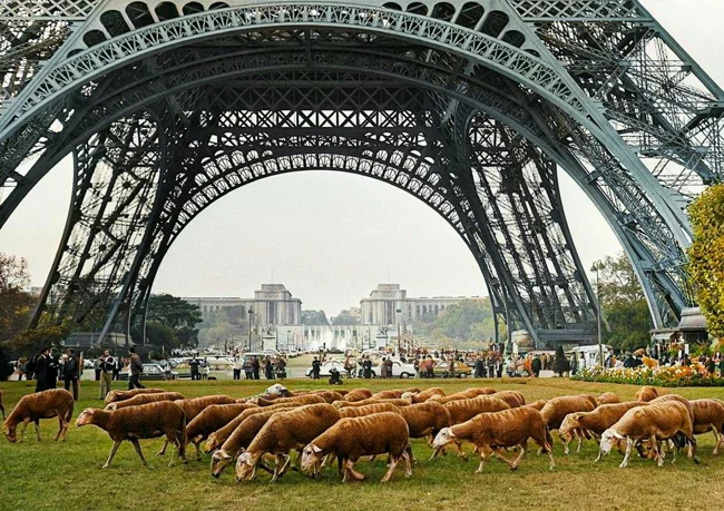Французские фермеры и их овцы протестуют у Эйфелевой башни против строительства военной базы на своих землях, 1972 год.