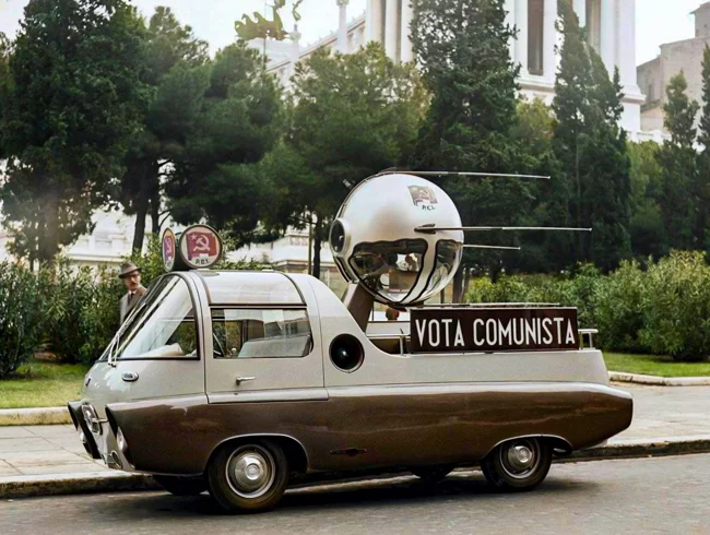 Агит-автомобиль итальянской компартии с макетом советского спутника, 1958 год.