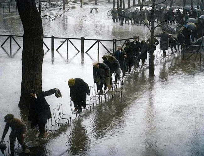 Наш человек снял бы ботинки, задрал штанины и смело пошел по воде. Если честно, так себе наводнение... Ножки у стульев даже не 1/2 в воде. Да и сама переправа не вызывает доверия.