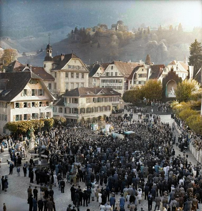 Толпа людей и памятник Винкельриду на площади города Штанс, кантон Нидвальден, Швейцария, 1940-е.