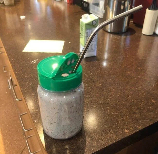 Моя коллега использует баночку для посыпки пармезаном как стакан для смузи