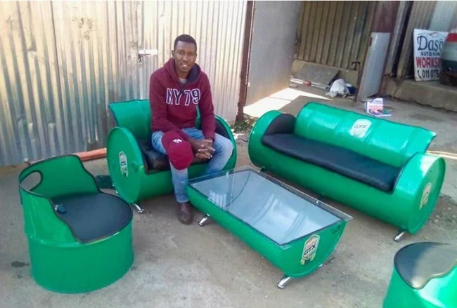 А здесь целый мебельный гарнитур — из старых бочек
