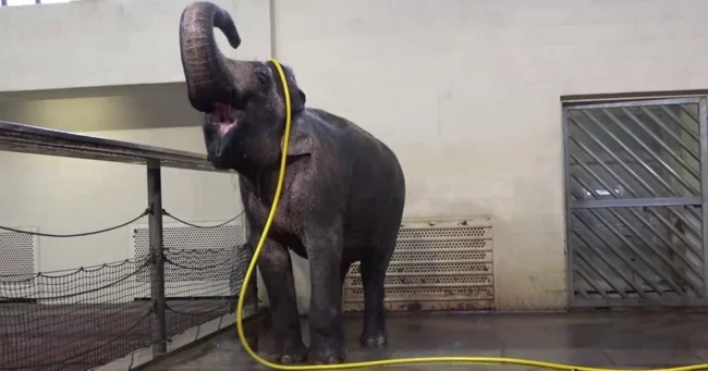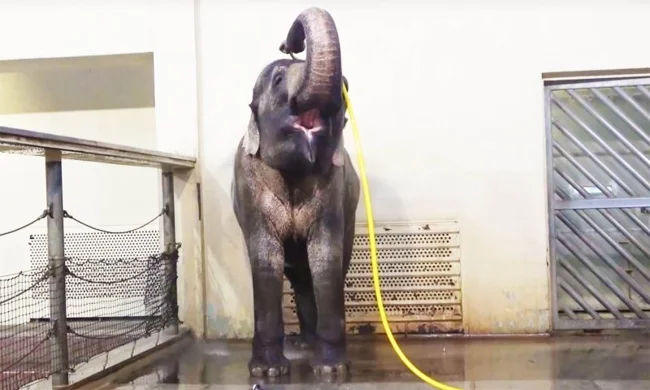 Слониха по кличке Анчали пыталась помешать своей подруге Мэри принять душ. Животное пережало шланг, тем самым перекрыв поток воды.