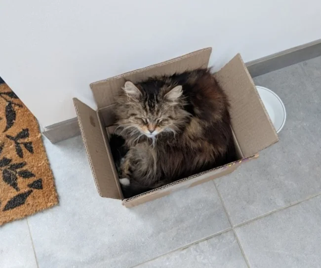 Конечно, Уиллоу не была бы истинной кошкой, если бы ей не пришлась по вкусу маленькая картонная коробочка. У Роуз после переезда таких осталось много — лучшая кроватка для пушистой гостьи.
