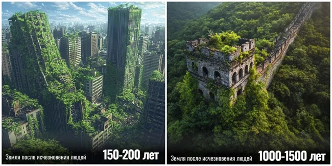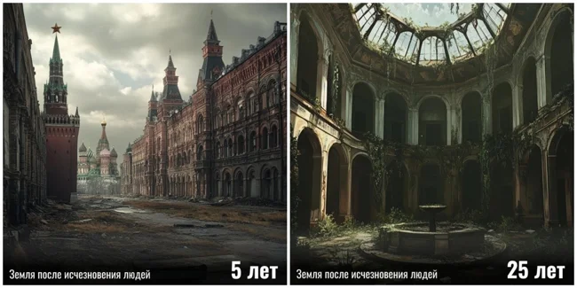 Большая часть городов будет покрыта землёй и растениями. Красная площадь покроется травой, здания начнут разрушаться. От человечества останется только воспоминание.