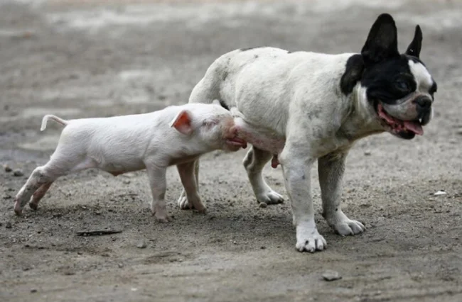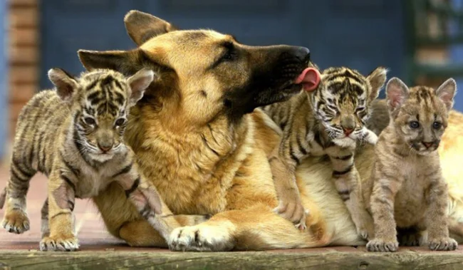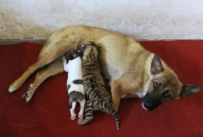 19. Собака приняла тигрёнка как своего детёныша и выкармливает его наравне с собственным щенком