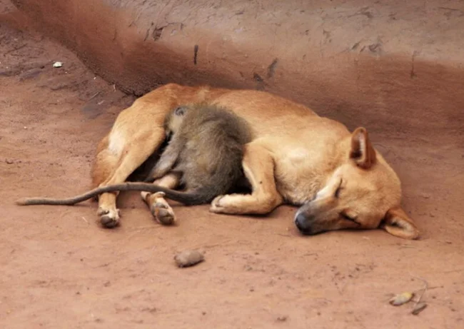 7. А ведь вместе намного теплее и приятнее. Обезьяна спит, прижавшись к собаке