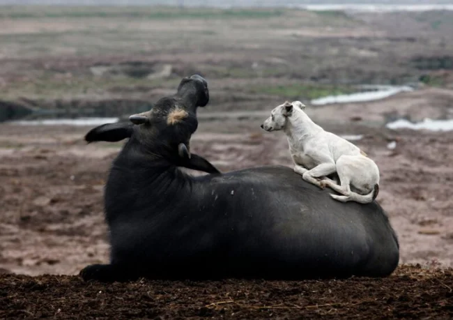 11. Буйвол очень рад своему другу и разрешает ему полежать на своей спине, чтобы отогреть замёрзшие лапы