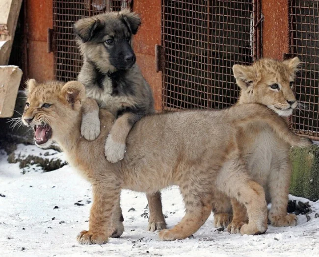 2. Во дворе обычного дома парочка юных львят дружат с будущим охранником дома: и кто до сих пор верит в выражение «как кошка с собакой»?