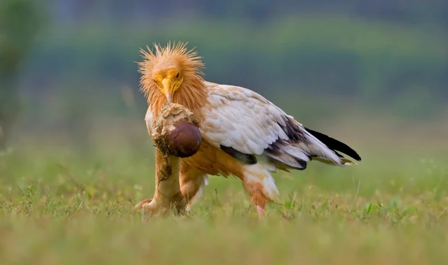 Столь специфичная диета обусловлена двумя вещами. Во-первых, фараоновы любимчики не вышли размером для конкуренции за самые лакомые части туш. В среднем они весят около 2 килограмм, а размах крыльев достигает не больше 1,7 метра. На посмертном пиршестве стервятники смиренно ждут своей очереди, когда более крупные пернатые падальщики насытятся и улетят восвояси. Длинным клювом-пинцетом удобно подчищать все кусочки из самых труднодоступных частей скелета. Но наестся такими остатками досыта почти нереально! Вот и приходится есть то, на что никто не покусится.