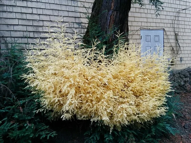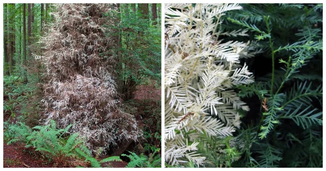 Однако есть и исключение. Исследователи заметили несколько красных деревьев-альбиносов (Albino redwood) в Калифорнии, которые сумели дожить до взрослого возраста, прижившись к родительскому красному дереву и используя его питательные вещества.