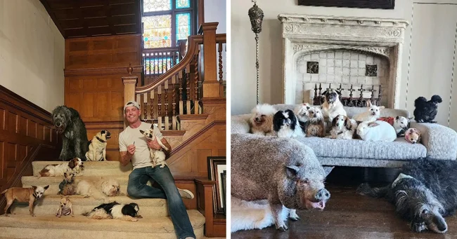 Он заботится о десяти пожилых собаках, а также об индейке, свинье и курице. Взгляните на их необычную семью!
