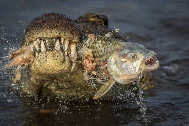 Например, загонять рыбёшек на мелководья, где они жёстко ограничены в перемещении. Используя свою длинную тушку как загородку, а хвост — как гибрид сачка и весла, хищник отрезает рыбке путь к свободе и быстро ловит загнанную жертву. Мелочь проглатывается на месте, а добычу покрупнее рептилия вытаскивает на берег. Крокодил будет лупасить рыбой об землю до тех пор, пока та не согласится стать обедом.