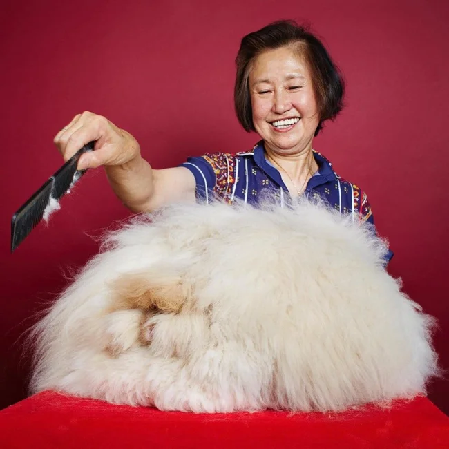 Шерсть Франчески составляет в длину 36,5 сантиметров. Из-за чрезмерной пушистости крольчиху часто путают с пекинесом.