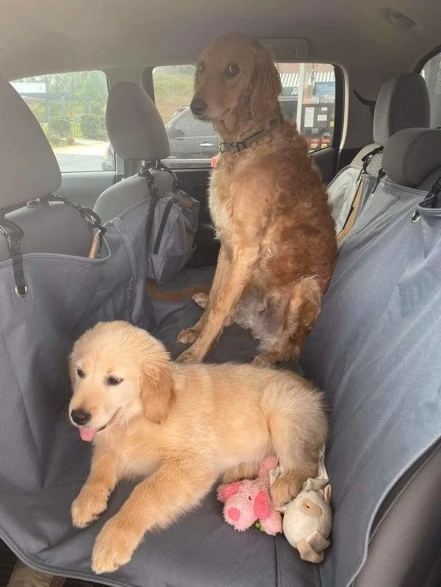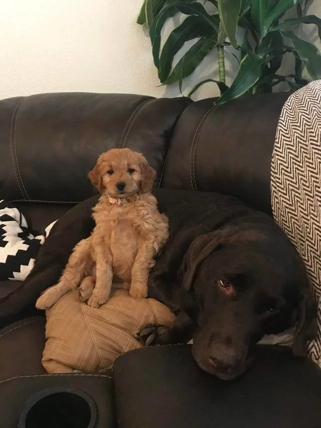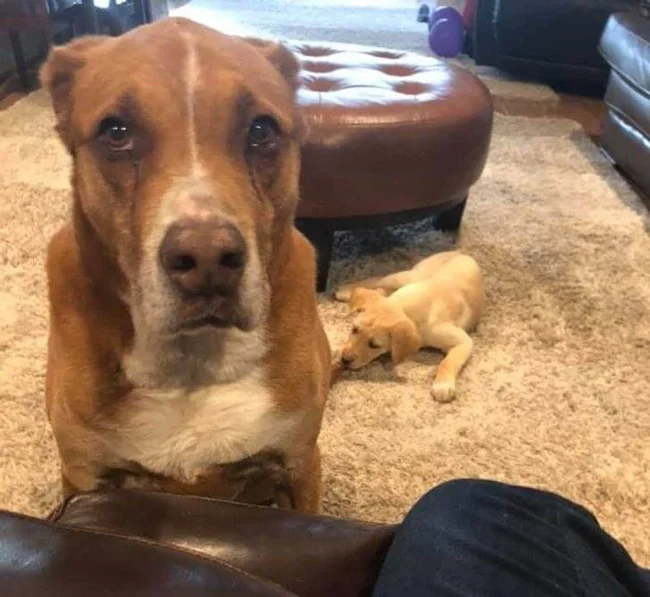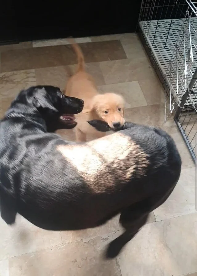 Когда мы брали нового щенка, я переживала, что старший пёс может его напугать