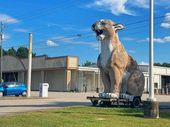 Гигантская кошка медленно перемещается по парковке автосалона в Зебулоне – небольшом городе в Северной Каролине.