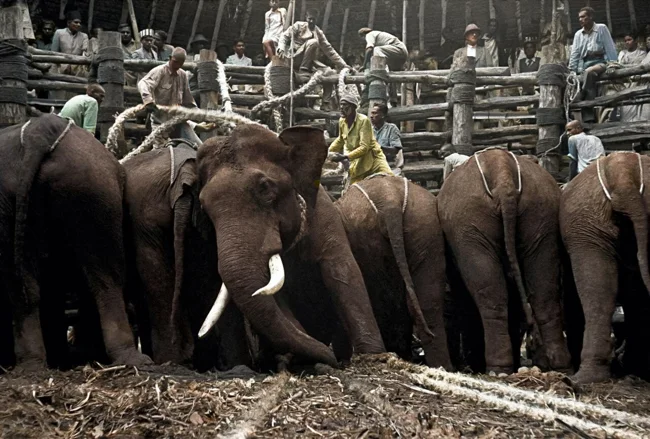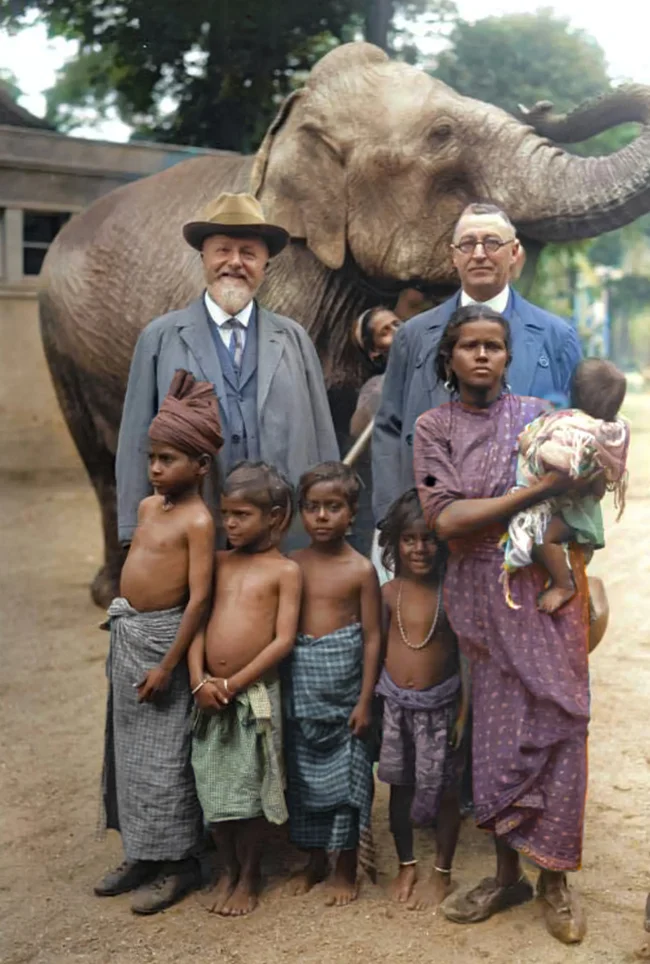 Немецкий торговец животными и владелец плантации Джон Хагенбек и немецкий зоолог Людвиг Хек с местными жителями и слоном. Южная Азия, 1931 год. Также Джон Хагенбек набирал людей для человеческих зоопарков в Европе. Последний людской зоопарк закрыли в Голландии в 1958 году.