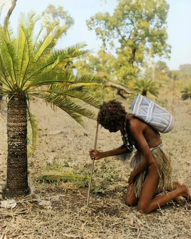 Добыча пищи Женщина-аборигенка копает землю в поисках еды рядом с пальмой Макрозамия, орехи которой можно использовать для приготовления муки. Австралия, 1955 год.