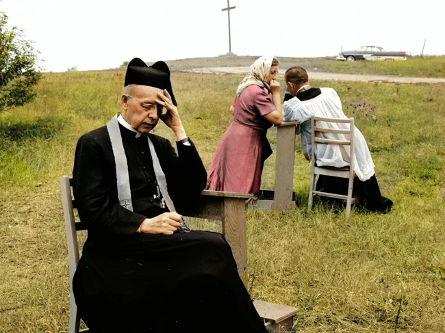 Священник на переднем плане уже наслушался, теперь борется с профессиональным выгоранием. Ох, нелёгкая это работа - любить ближнего своего, зная его так подробно.