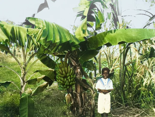 Мальчик у грозди бананов, свисающей с куста. Ямайка, 1900 год.