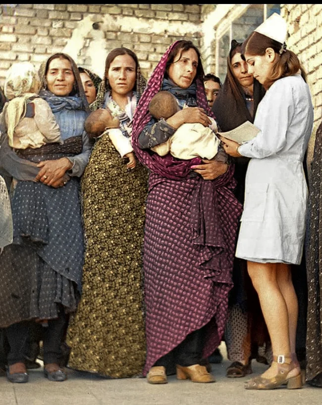 Медсестра в Медицинском учреждении обучает сельских женщин методам и формам контроля рождаемости. Иран, 1960-е годы.