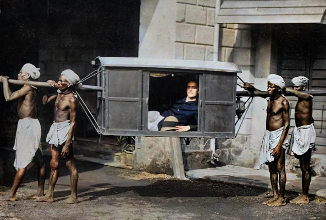 Четыре индийских носильщика несут западного туриста в паланкине. Индия, 1922 год.