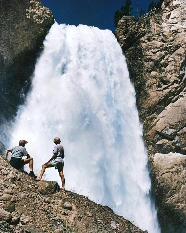 Туристы у нижнего водопада в Йеллоустонском национальном парке, 1946 год.