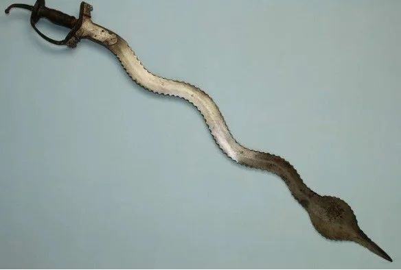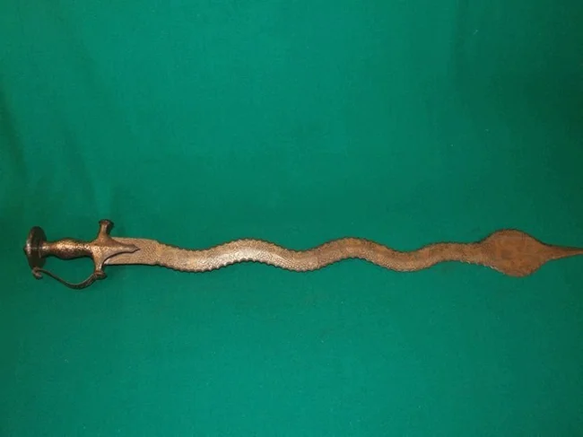 Необходимо отметить, что клинок индийского меча наган помимо пламенеющей формы в обязательном порядке обладает еще и зазубренным по всей длине лезвием. А вот "капюшон" вблизи острия хоть и встречается достаточно часто, придавая дополнительный шарм оружию, но не является обязательной его деталью.