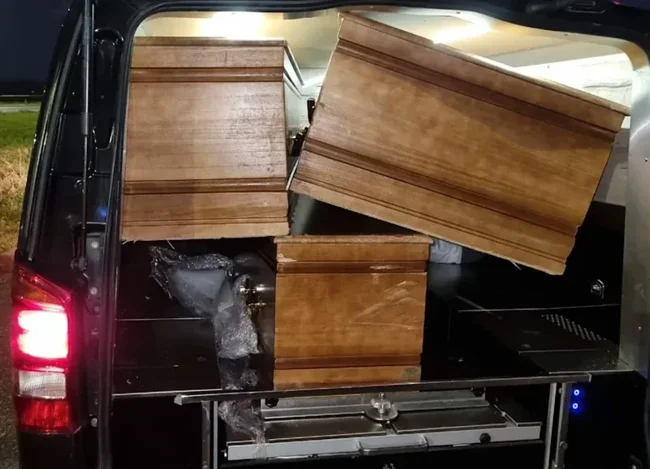 Во время проверки 30-летний мужчина заявил, что перевозит несколько опечатанных гробов, в каждом из которых, по его словам, лежали покойники. Однако водитель не смог предъявить необходимые документы для перевозки, именно поэтому у стражей порядка возникли подозрения.