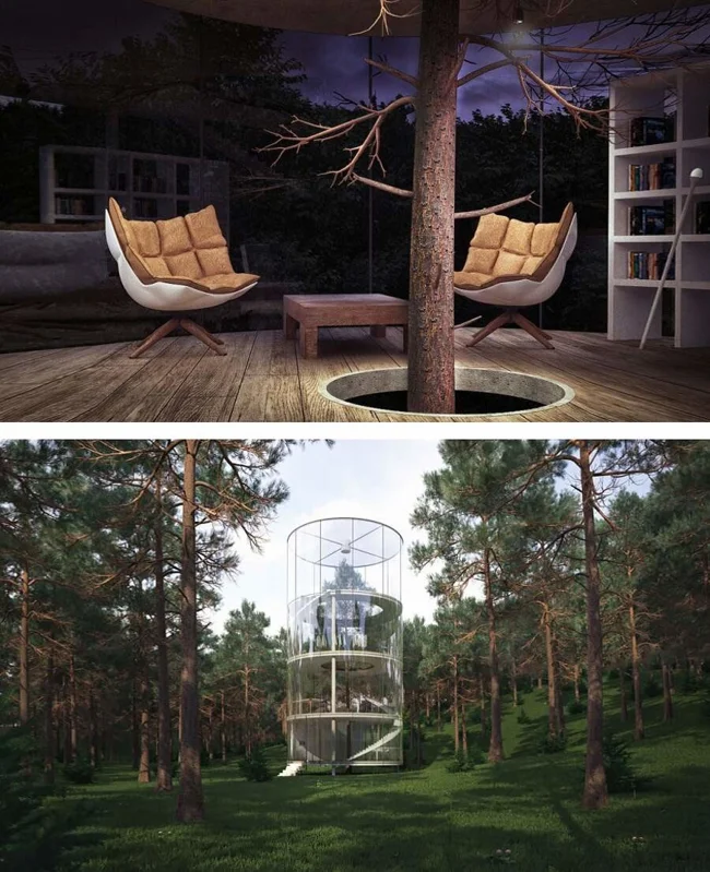 7. Цилиндрический стеклянный дом, построенный вокруг дерева