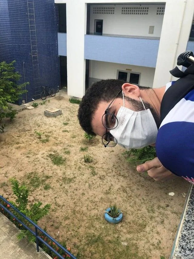 Можно подумать, что перед нами макет двора или человек-гигант, но всё гораздо проще. Молодой человек находится на втором этаже, откуда и был сделан кадр.