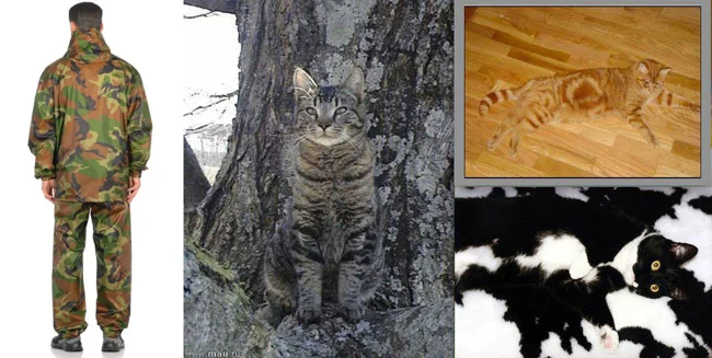 Первые поколения одомашненных котов комплектовались пятнисто-полосатым камуфляжем типа "лес", сейчас есть модели для маскировки в осенней листве, снегу, и на диване.