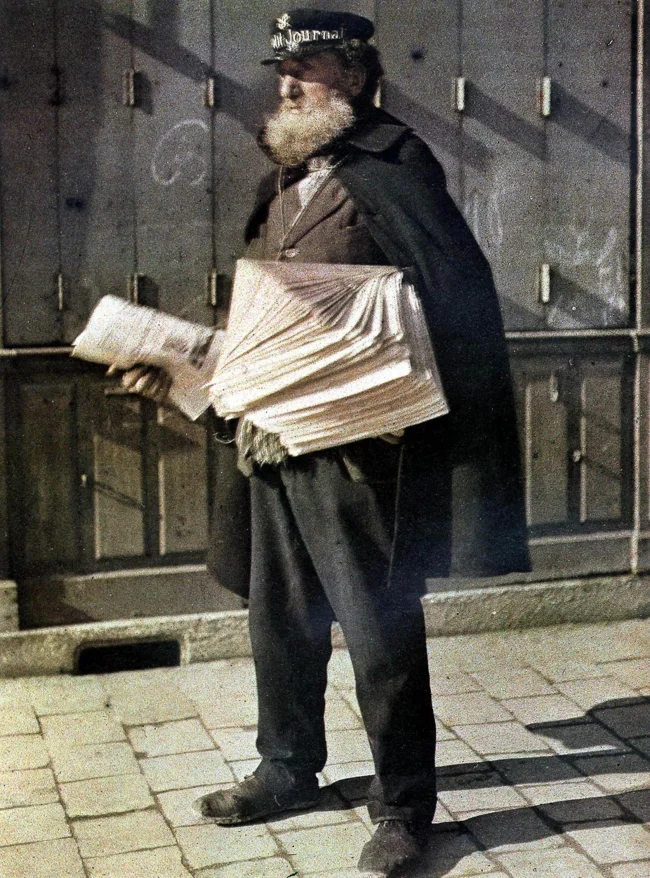 Продавец газет на улице Реймса, Франция, 1917, автохром