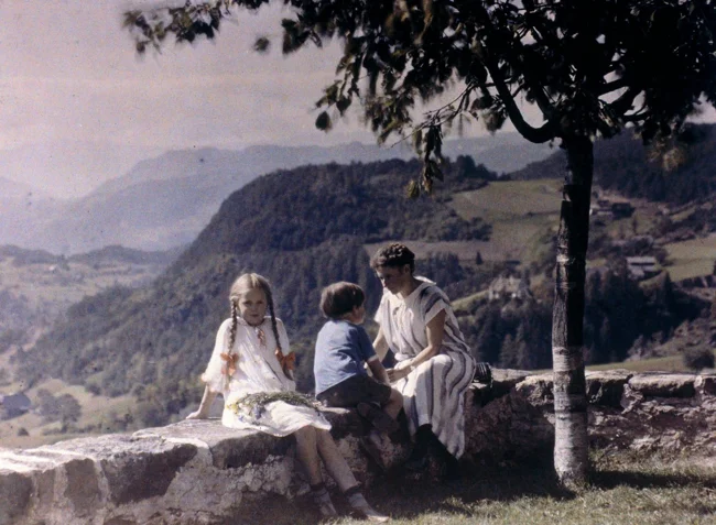 Эльза, Ева и Хайнц (дети и жена фотографа) сидят на стене, 1924. Автохром, фотограф Фридрих Панет