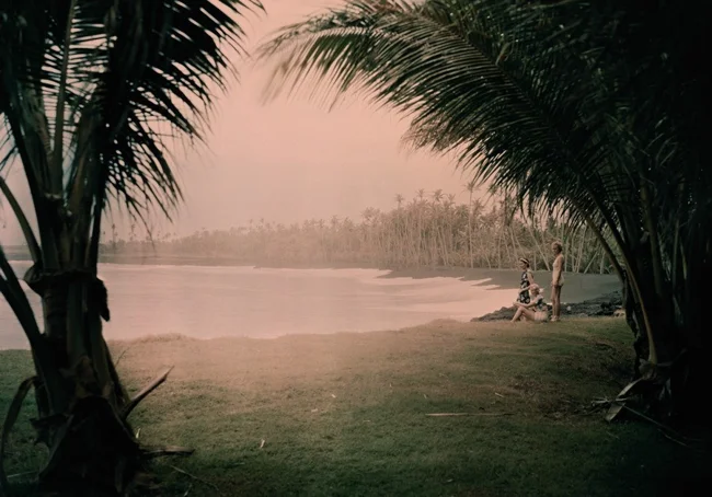 На пляже с чёрным песком, Гавайи, 1937. Автохром, фотограф Ричард Стюарт Хьюитт
